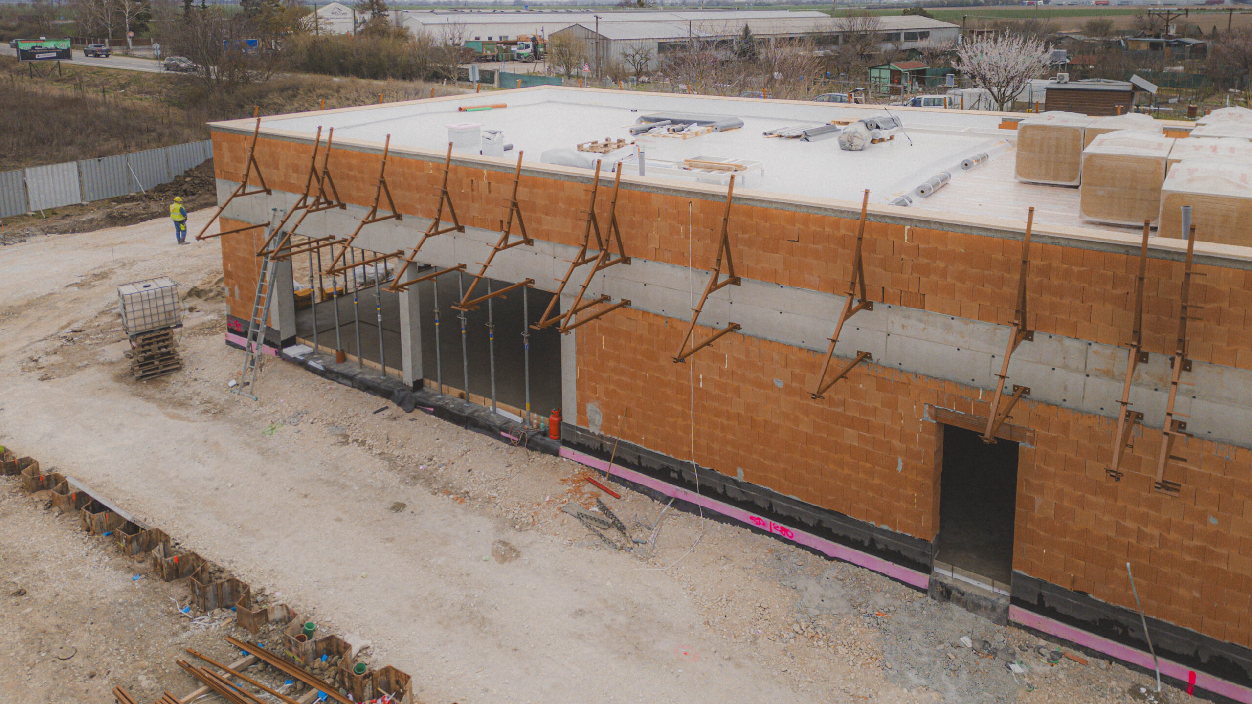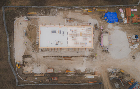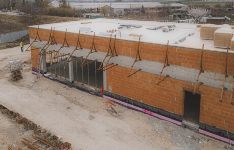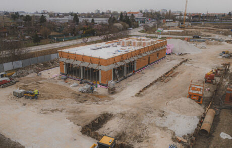 Po dokončení skeletu sme stavbu uzavreli a pokračujeme v realizácii vonkajších prvkov fasády a oplechovania. Súbežne prebiehajú práce aj v interiéri. Zároveň realizujeme spevnené plochy – pripravujeme podklady pre cesty, parkoviská a chodníky. Stavba sa aktuálne nachádza v pokročilej fáze a blíži sa k dokončeniu.